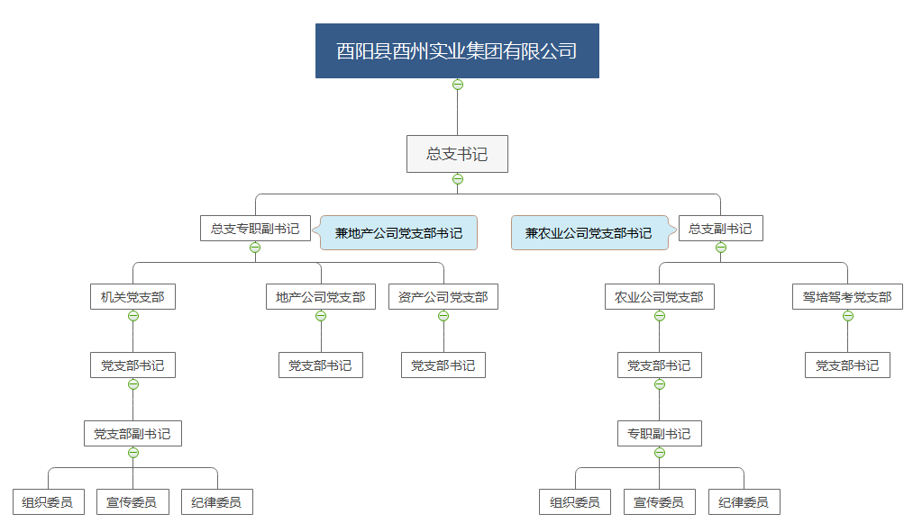 中共酉陽縣酉州實業(yè)集團有限公司總支部委員會: 冉勇為黨總支部書記、楊秀峰為總支部副書記,張光流為紀律委員、冉華偉為宣傳委員、張宗孝為組織委員。